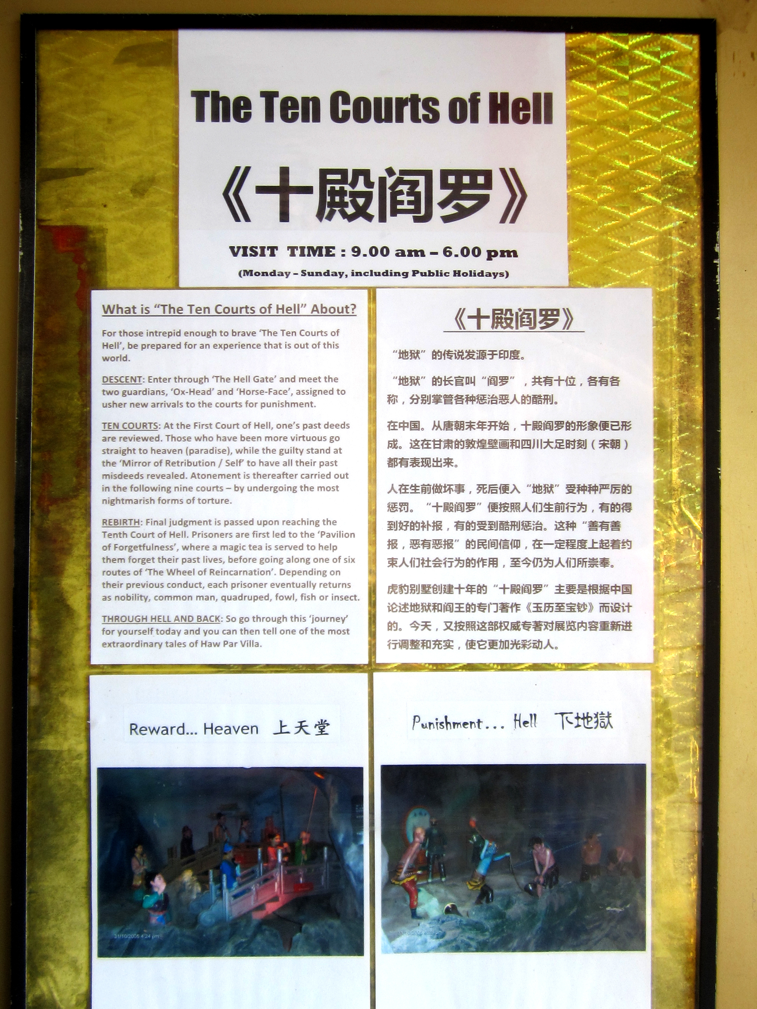 It’s known for the Ten Courts of Hell attraction, a graphic depiction of a quasi-Buddhist Chinese afterlife of judgment, punishment and subsequent reincarnation.