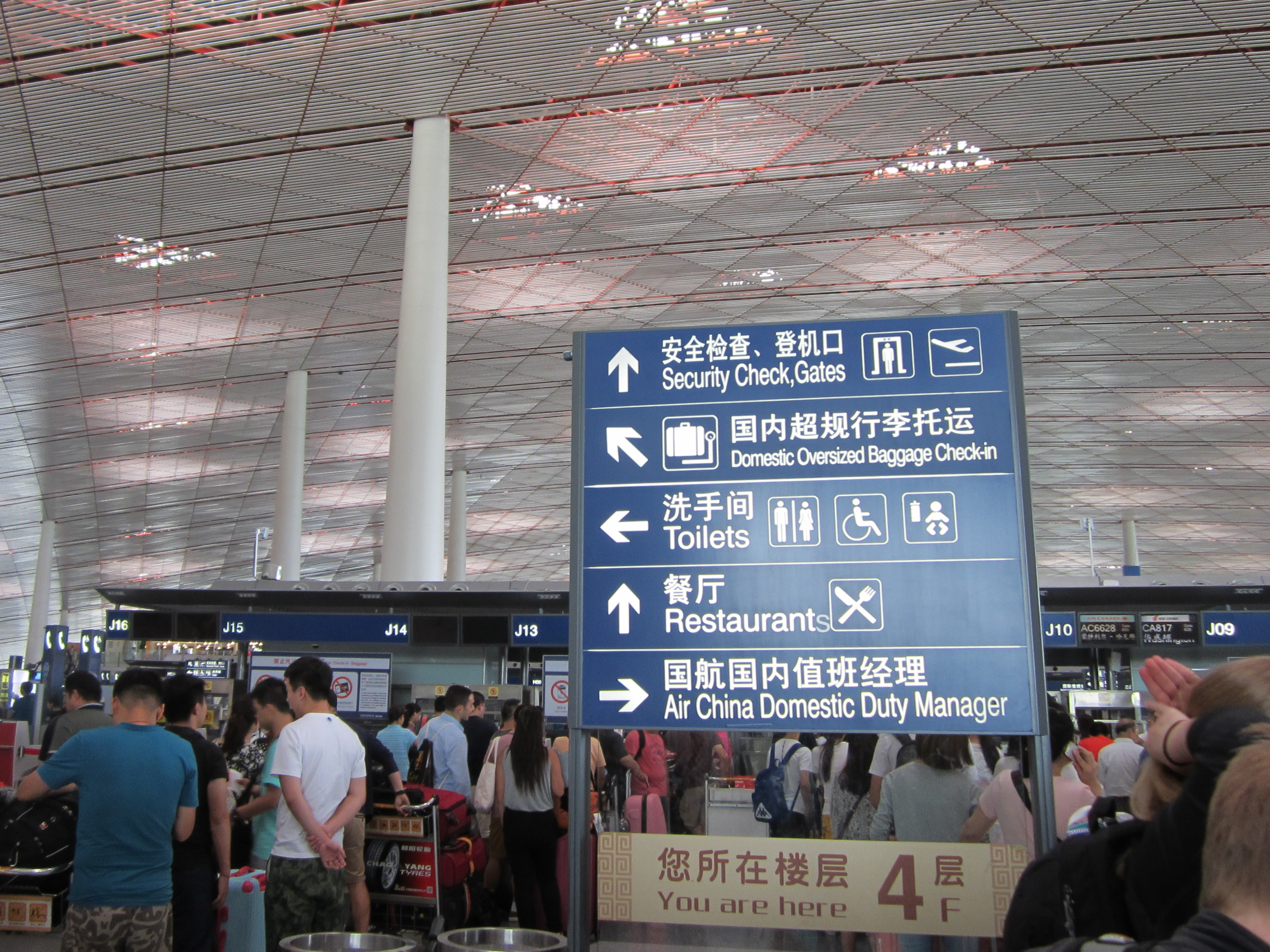 The check-in lines at Air China in Beijing were a mess, but I smiled when I noticed that someone had added a letter s to the end of “Restaurant” on this sign.